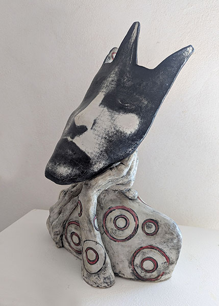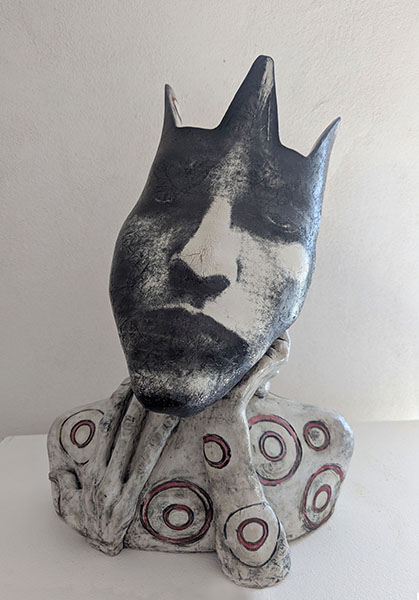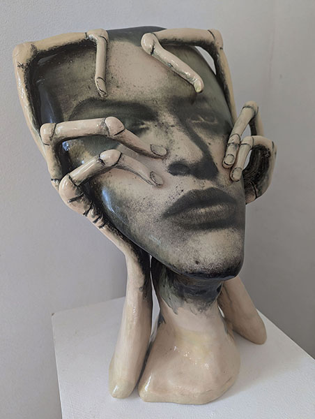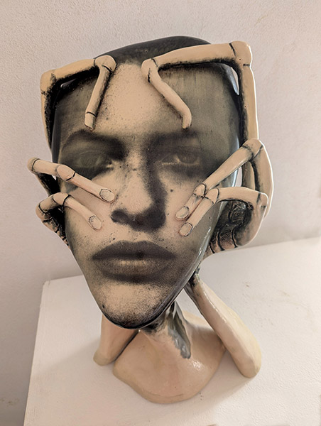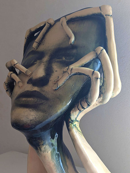 In my sculpture, “Inner Web,” the fingers have metamorphosed into spiders legs. She is entangled in a spider’s web.